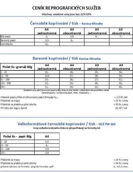 Digitální reprografické stroje OCÉ, Minolta a Canon s možností digitalizace klasických výkresů do formátu .TIFF či PDF a jejich následné zálohy na paměťové médium.