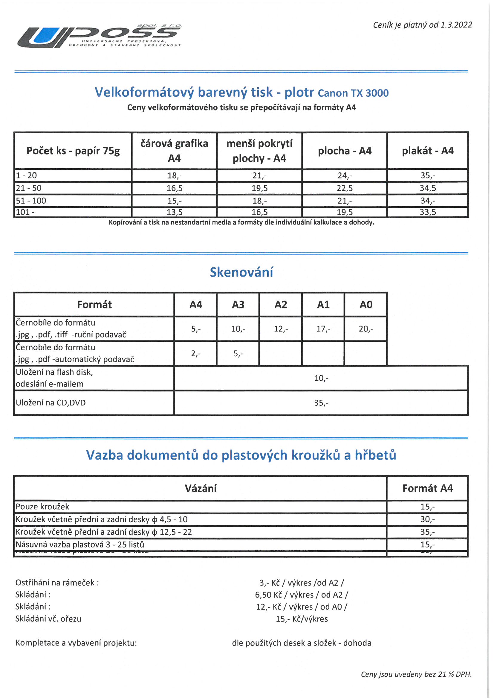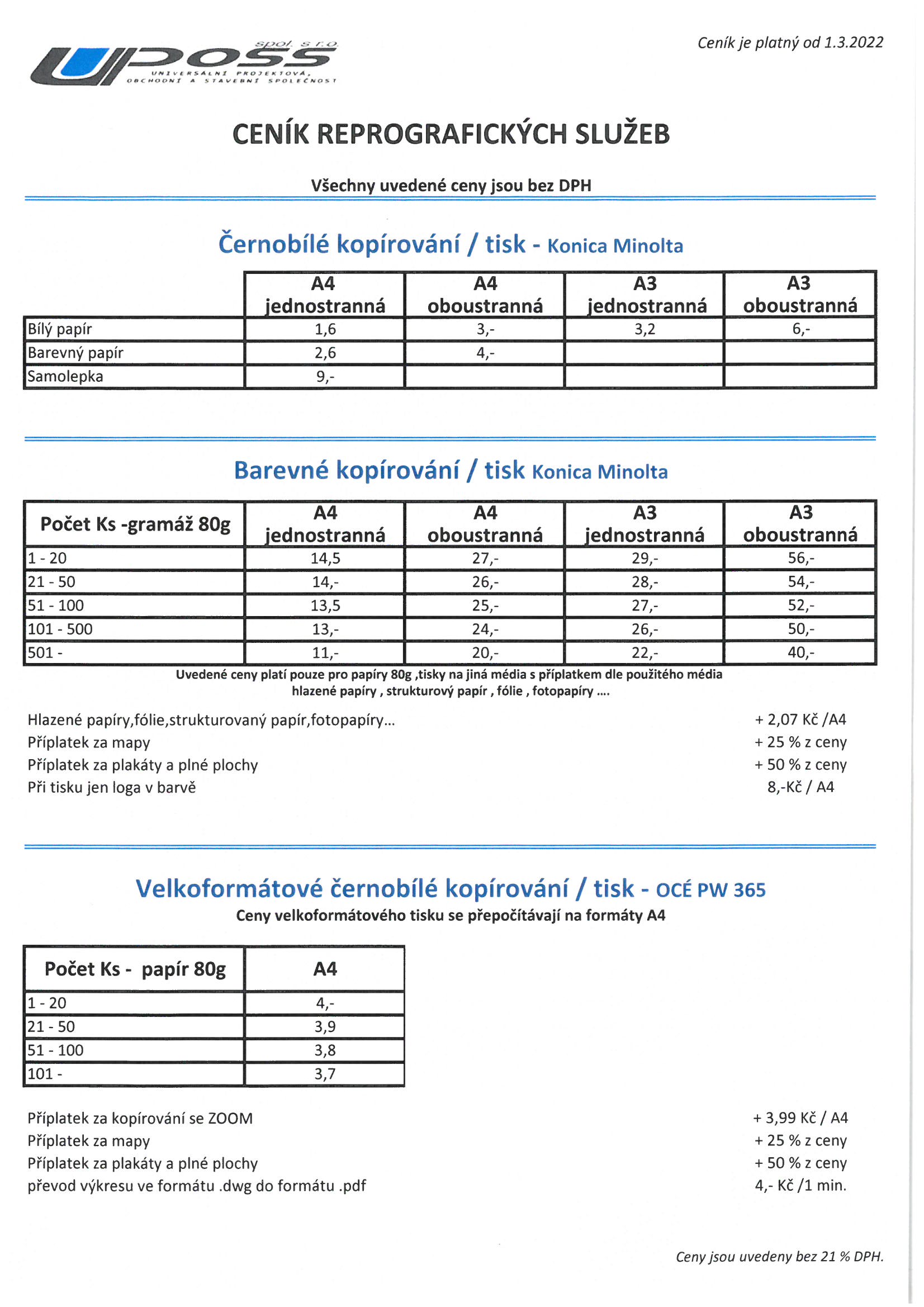 Digitální reprografické stroje OCÉ, Minolta a Canon s možností digitalizace klasických výkresů do formátu .TIFF či PDF a jejich následné zálohy na paměťové médium.